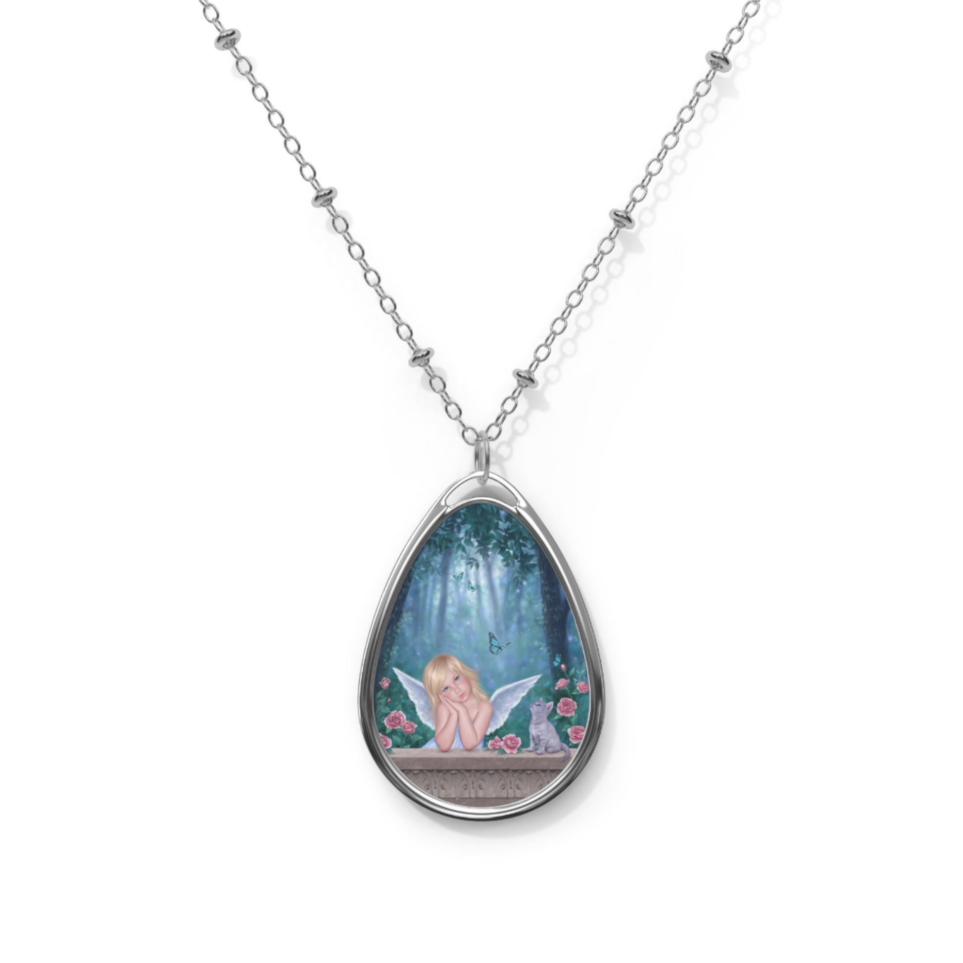 With a unique oval teardrop shape, this pendant is a stylish way to show off your favorite fairy artwork. The pendant measures 1x1.5 inches and the included chain measures 20.47 inches. Both are made of durable silver toned zinc alloy, and the artwork is coated with a glossy finish.