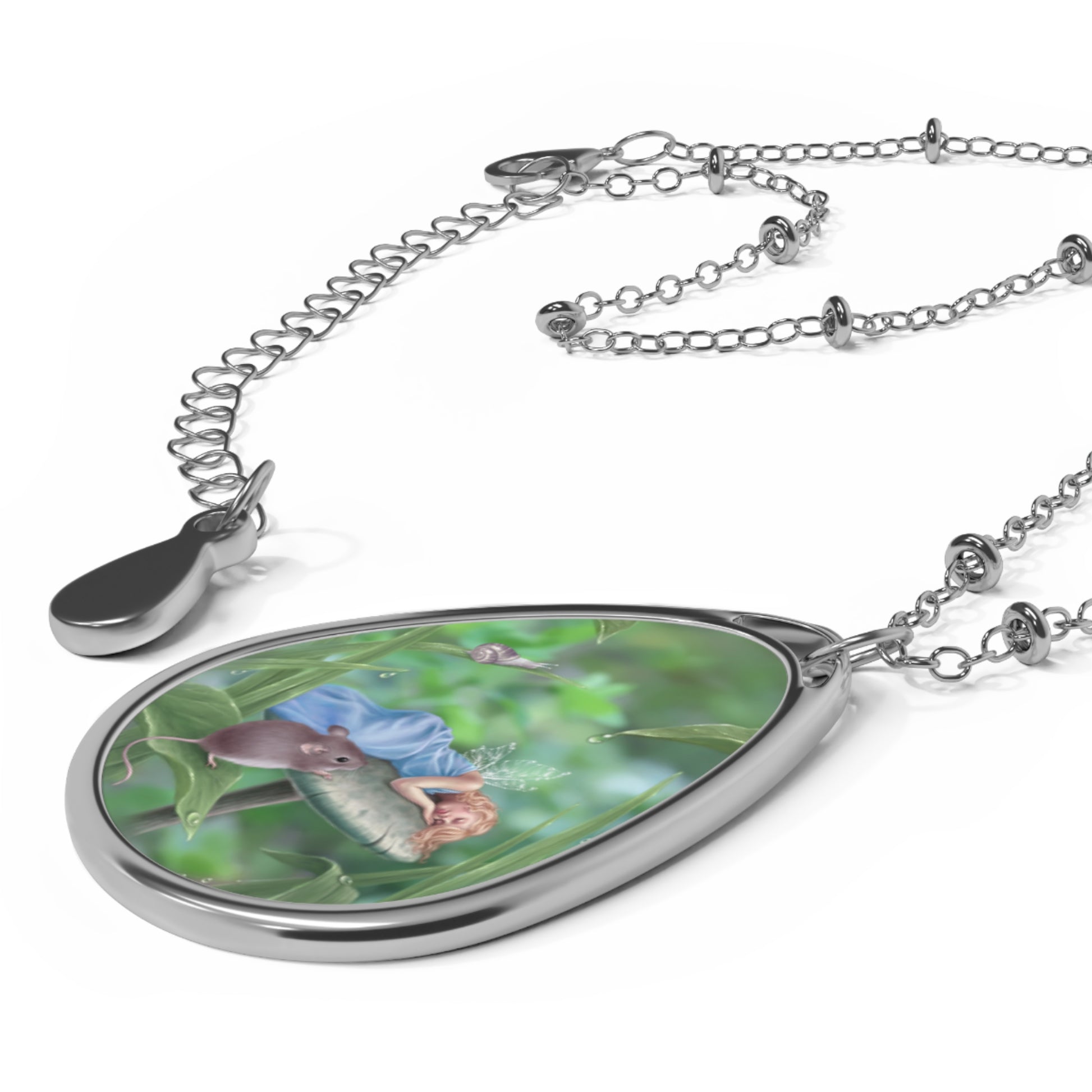 With a unique oval teardrop shape, this pendant is a stylish way to show off your favorite fairy artwork. The pendant measures 1x1.5 inches and the included chain measures 20.47 inches. Both are made of durable silver toned zinc alloy, and the artwork is coated with a glossy finish.