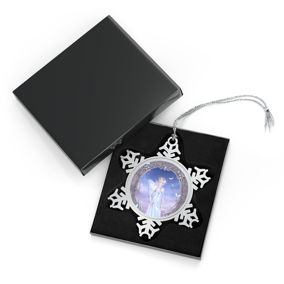 These high-quality pewter snowflake ornaments are a unique way to show off your favorite fairy and fantasy artwork. Each is printed in full color on an aluminum insert which has a shimmery pearlescent finish and comes packaged in a black gift box for safe keeping.